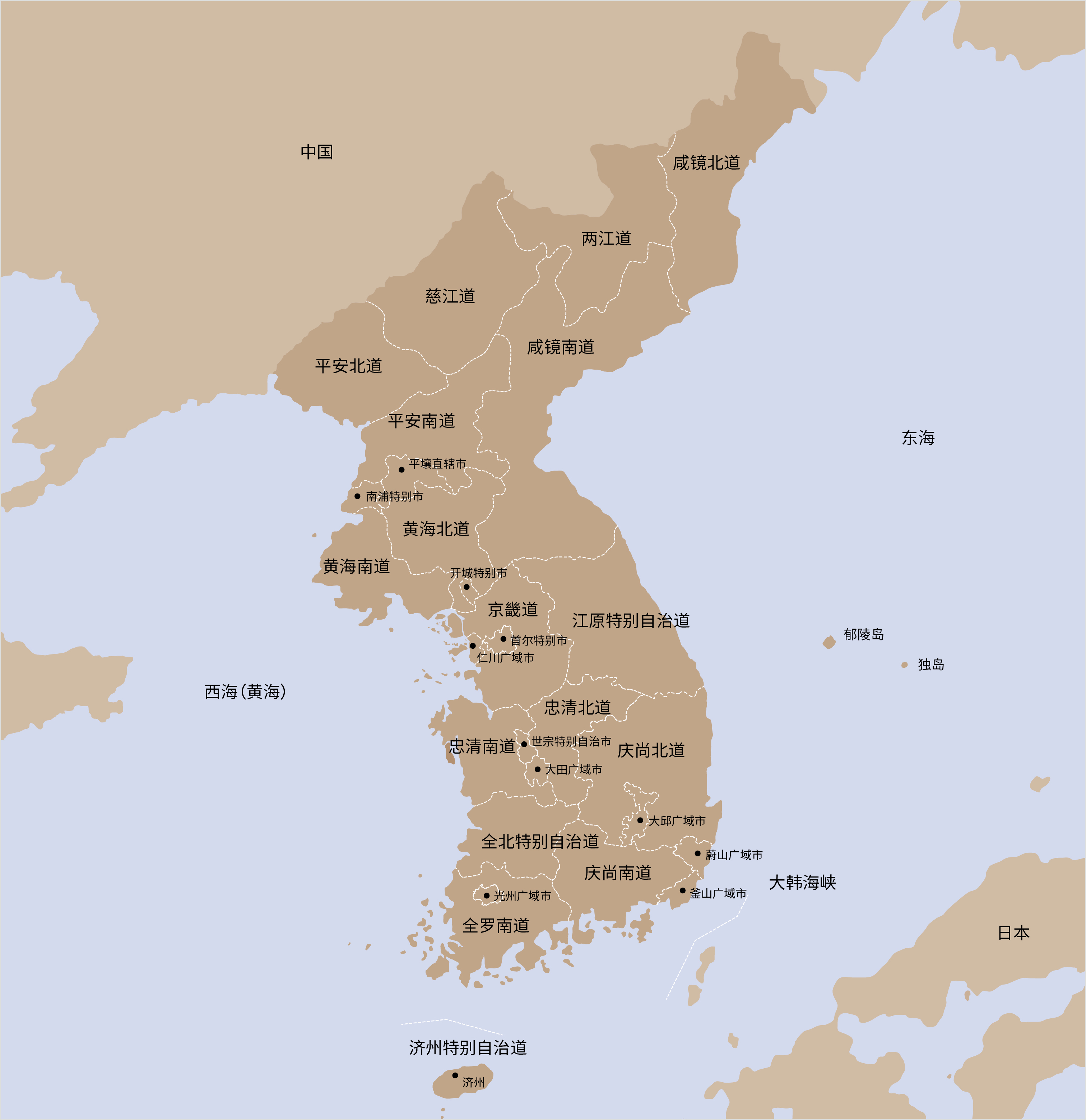 韩半岛位于东经124°至132°之间,坐落在欧亚大陆的东部、北太平洋的西北部。北面与中国、俄罗斯接壤,南面隔着大韩海峡与日本相望。