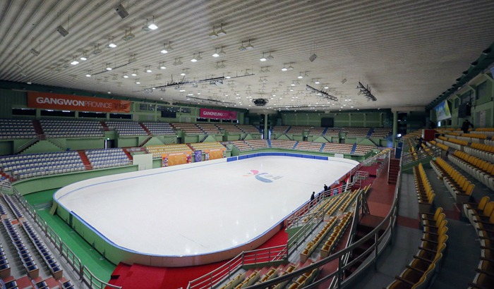将举办短道速滑、速度滑冰、地板曲棍球等比赛的江陵室内综合体育馆内景(摄影:全汉记者)