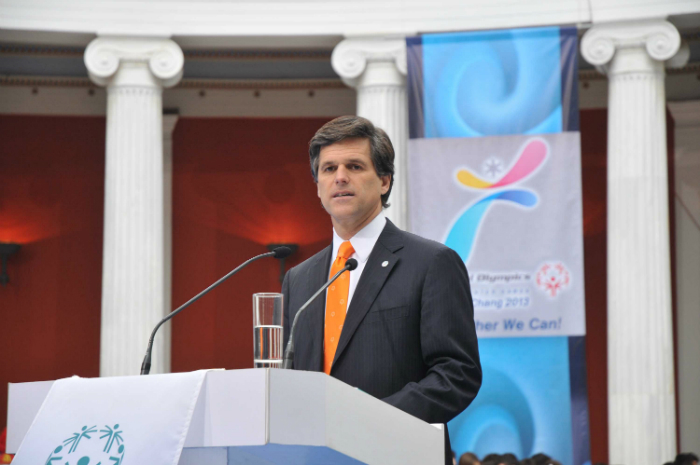 国际特奥会主席蒂姆•施莱佛在希腊雅典扎皮翁宫举行的圣火采集仪式上进行演讲。
