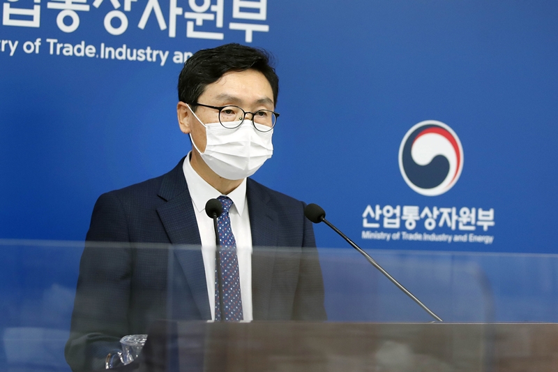 10月7日上午,韩国产业通商资源部投资政策官郑钟荣在政府世宗办公大楼,正在就2021年前三季度外商直接投资(FDI)动向举行新闻发布会。图片来源:产业通商资源部