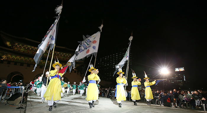 5号举办的“阿里郎节”上,鼓乐队发出了庆典开始的讯息进入了兴礼门广场,后面跟随着四物农乐帮的表演助兴。