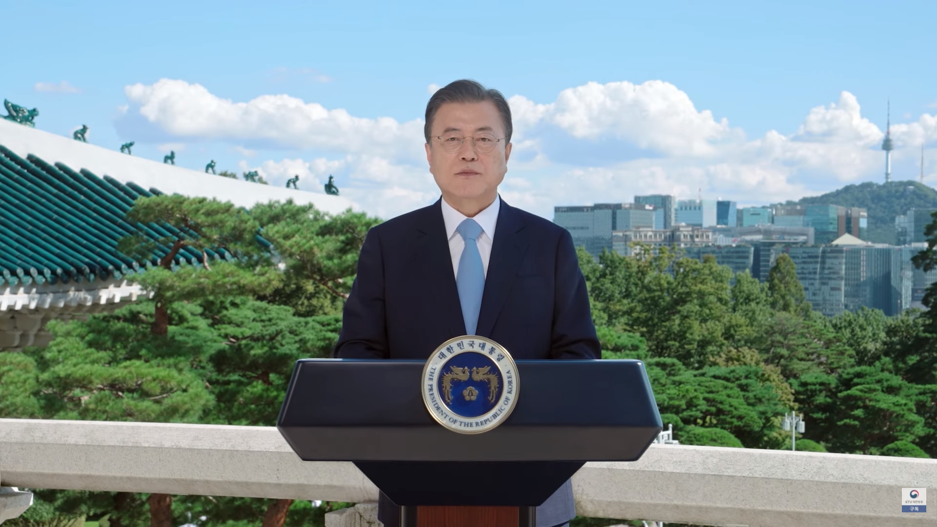 9月7日,韩国总统文在寅为纪念第二个“国际清洁空气蓝天日”发表视频致辞。图片来源:KTV YouTube频道截图