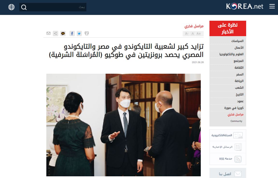 排名第一的报道是《在埃及备受欢迎的跆拳道》,讲述跆拳道在埃及的历史和在奥运会等国际体育赛取得的成就。自1978年埃及跆拳道联盟成立以来,跆拳道已成为埃及最受欢迎的体育项目之一。在埃及,推动并传播的跆拳道人是曾担任非洲跆拳道联盟会会长的Mohamed Ahmed El-Fouly去,年去世,享年72岁。任职期间将非洲跆拳道联盟发展为五大洲拥有最多会员国的联盟,为提高在非洲跆拳道的水平和地位,做出了巨大贡献。8月17日,韩国政府追授了体育勋章“青龙章”,以纪念他为跆拳道的推广和发展做出的努力和作用。报道中,韩国驻埃及大使洪镇郁向El-Fouly的家人传递了该奖项。