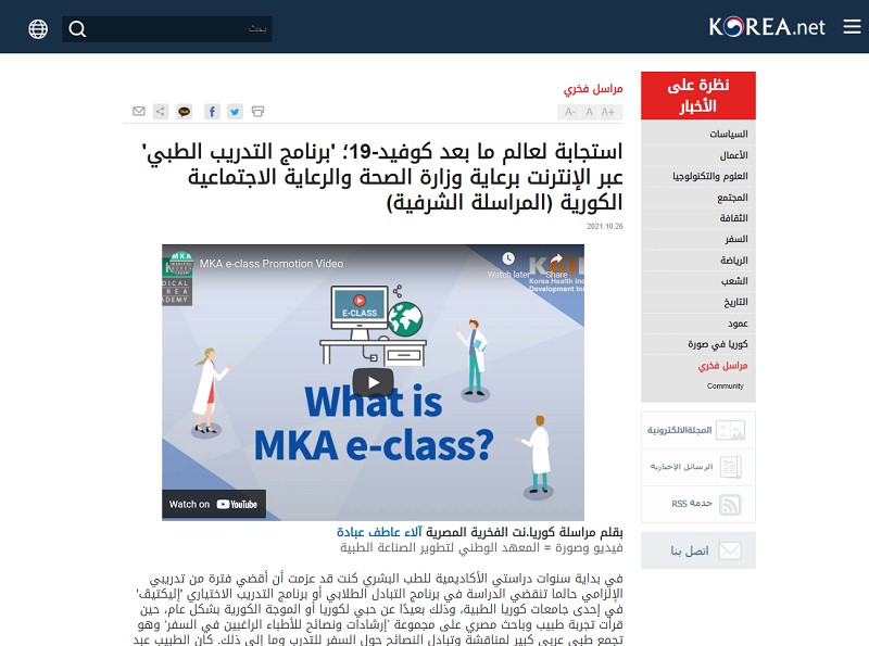 撰写第一报道的名誉记者Alaa Atef Ebada原来计划在韩国修完医生实习课程, 由于新冠肺炎疫情,不得不放弃。可是,今年6月1日起,Alaa Atef Ebada在韩国保健福祉部和韩国保健产业振兴院运营的“医疗韩国学院”(Medical Korea Academy)修完了为期6周的临床在线教育。他说,通过首尔大学、釜山大学、延世大学、梨花女子大学医院、峨山医院医护人员的演讲,可以体验到韩国成熟的医疗体系和先进的医疗技术。