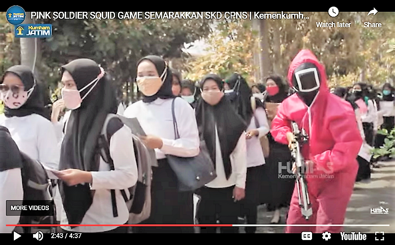 ■ 在印度尼西亚公务员考场,《鱿鱼游戏》粉红士兵监考了考生(Maulia Resta Mardaningtias,印度尼西亚,英语)