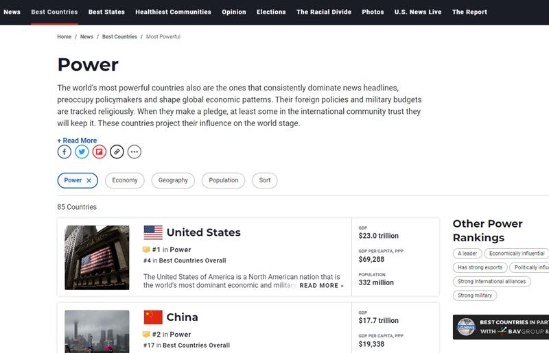 当地时间12月31日,在美国周刊《美国新闻与世界报道》(USNWR)公开的“2022年全球国力排名”中,韩国排名第六。图片来源:USNWR官网截图