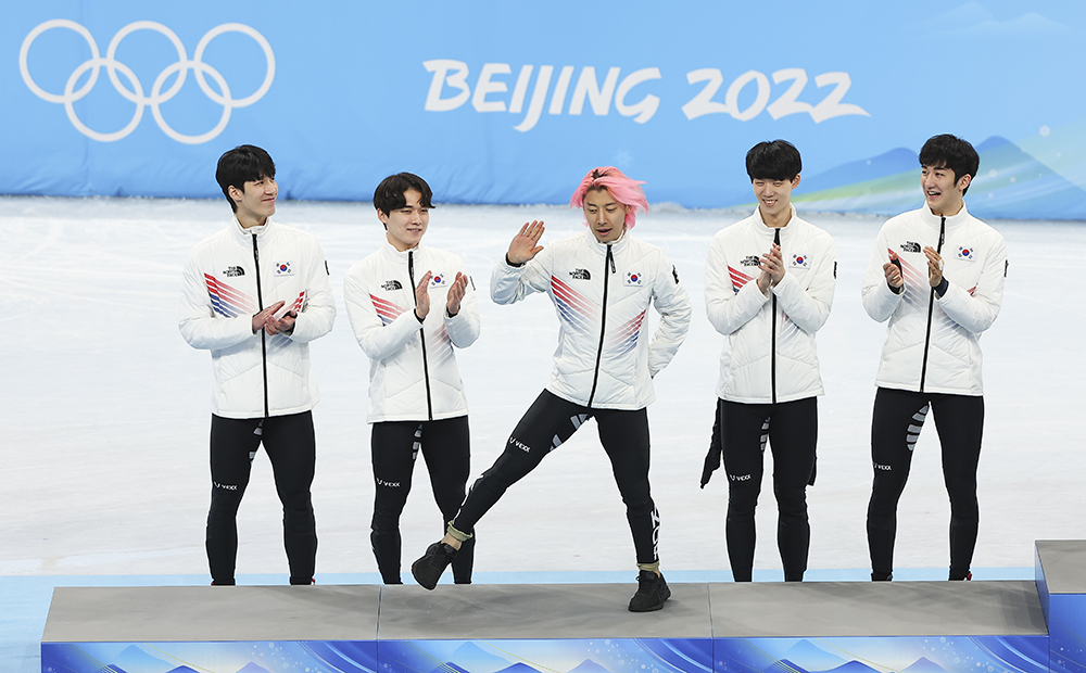 2月16日,韩国运动员郭润起在北京首都体育馆进行的2022年北京冬奥会短道速滑男子5000米接力颁奖仪式上,跳起防弹少年团(BTS)的舞蹈。图片来源:韩联社